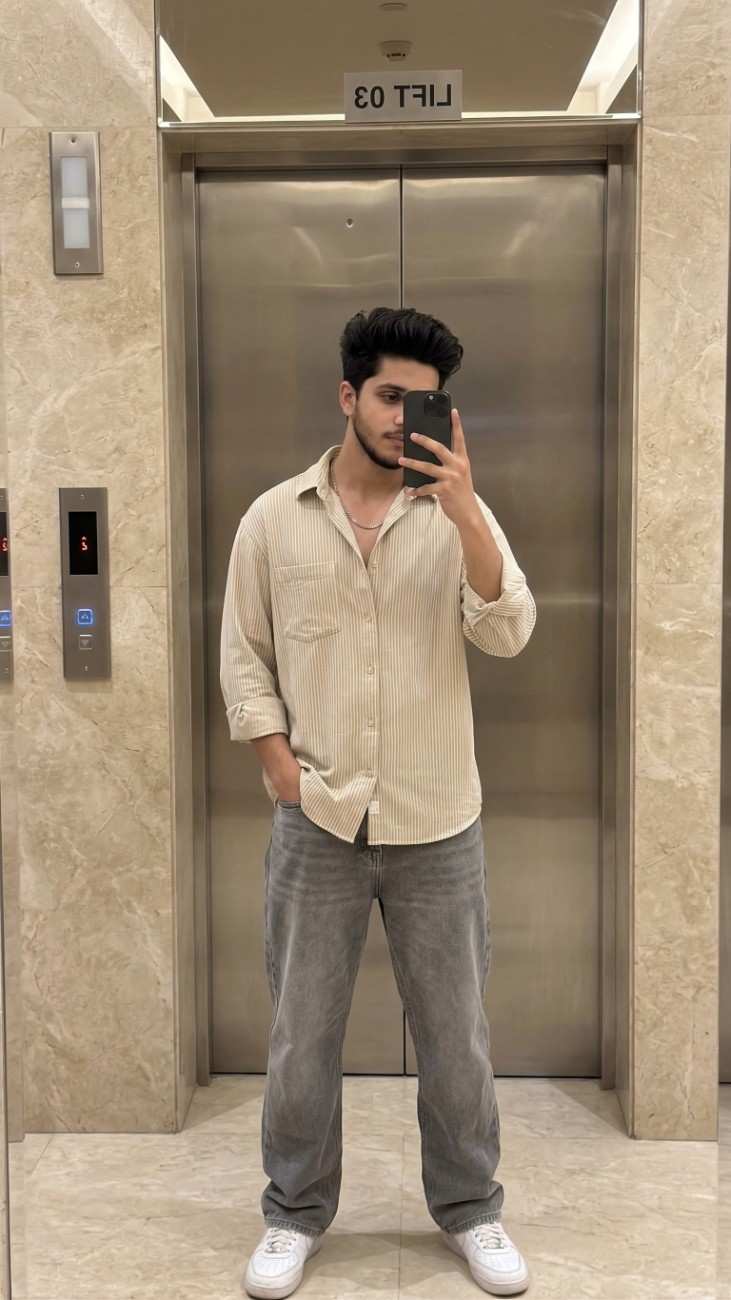 Create a image A full-body mirror selfie of a young stylish man slight gym body standing in front of closed stainless steel elevator doors. He is holding a space black colour I phone in front of his face, partially obscuring it. He has messy hairstyle, He is wearing a light-colored vertically strips full sleeve rolled shirt with a front pocket, grey baggy jeans wearing white sneakers and a subtle chain necklace.and one hand on his jeans ,The background features polished beige marble walls surrounding the metal doors, with an illuminated elevator button panel on the left. The reflection shows ‘LIFT 03’ near the top of the doors. Bright indoor lighting, capturing a modern, raw urban aesthetic.